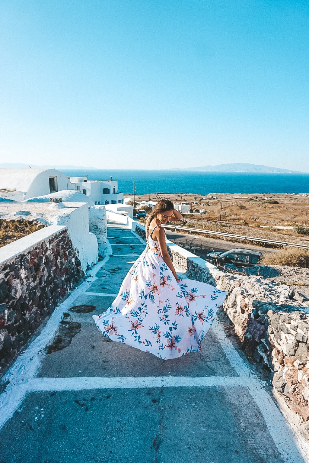 I was wearing a two-piece dress with a maxi skirt for our jaunt to Oia. Luckily the skirt had a fairly high split, so I didn’t have trouble sitting on the quad behind Timothy. I don’t believe in being overdressed, and if I have an opportunity to wear something gorgeous from lulus.com I’m going to do it! Timothy thought we should wear the included helmets, but I wanted to feel the wind in my hair so they went in the bin on the back. (Sorry mom!)